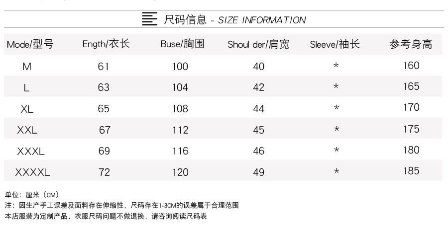 产品尺码:160(M)165(L)170(XL)175(XXL)180(3XL)185(4XL)