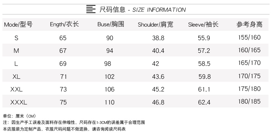 产品尺码:155(S)165(M)170(L)175(XL)180(XXL)185(XXL)