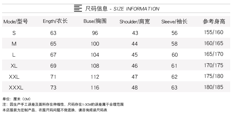 产品尺码:155(S)165(M)170(L)175(XL)180(XXL)185(XXL)