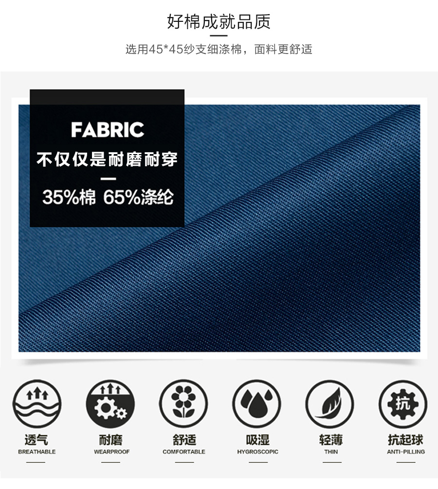 产品特点: 质地柔软,耐穿耐磨,尺寸稳定,不缩水,不起球。具有挺阔、不易褶皱,易洗快干的特点。